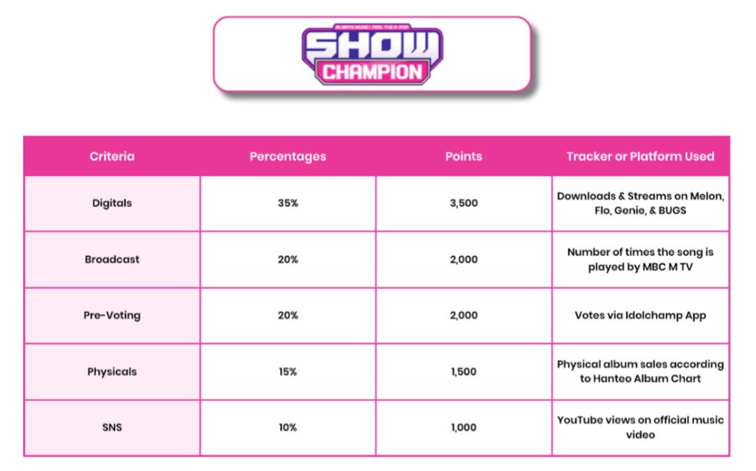 Live Broadcast: Wednesdays at 5:00 PM KST on MBC Music.IMOAs can watch Show Champion through ALL THE K-POP's YouTube channel.Tracking Period: From Monday to Sunday AT 11:59 PM KST.PRE-VOTING: From Friday at 8:00 PM KST to Monday at 3:00 PM KST on the IdolChamp App.